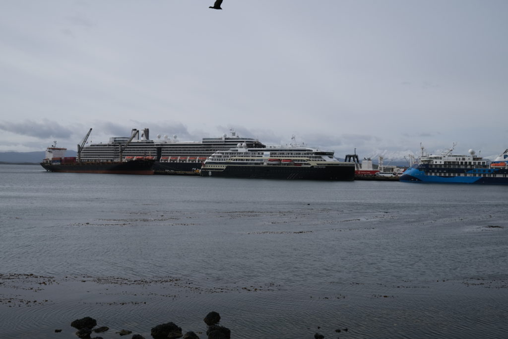 1月1日(木曜):朝起きてカーテンを開けたら港に大型客船が停泊しているのが見えた。ウシュアイアはビーグル水道に面した町で、太平洋・大西洋・南極へと航海する船が立ち寄る港町である。来る前のイメージ的には岩内町(北海道の日本海側の静かな港町)くらいかと想像していたが、割と大きな町で稚内と似ている感じがする。けれど函館ほど大きくはない。