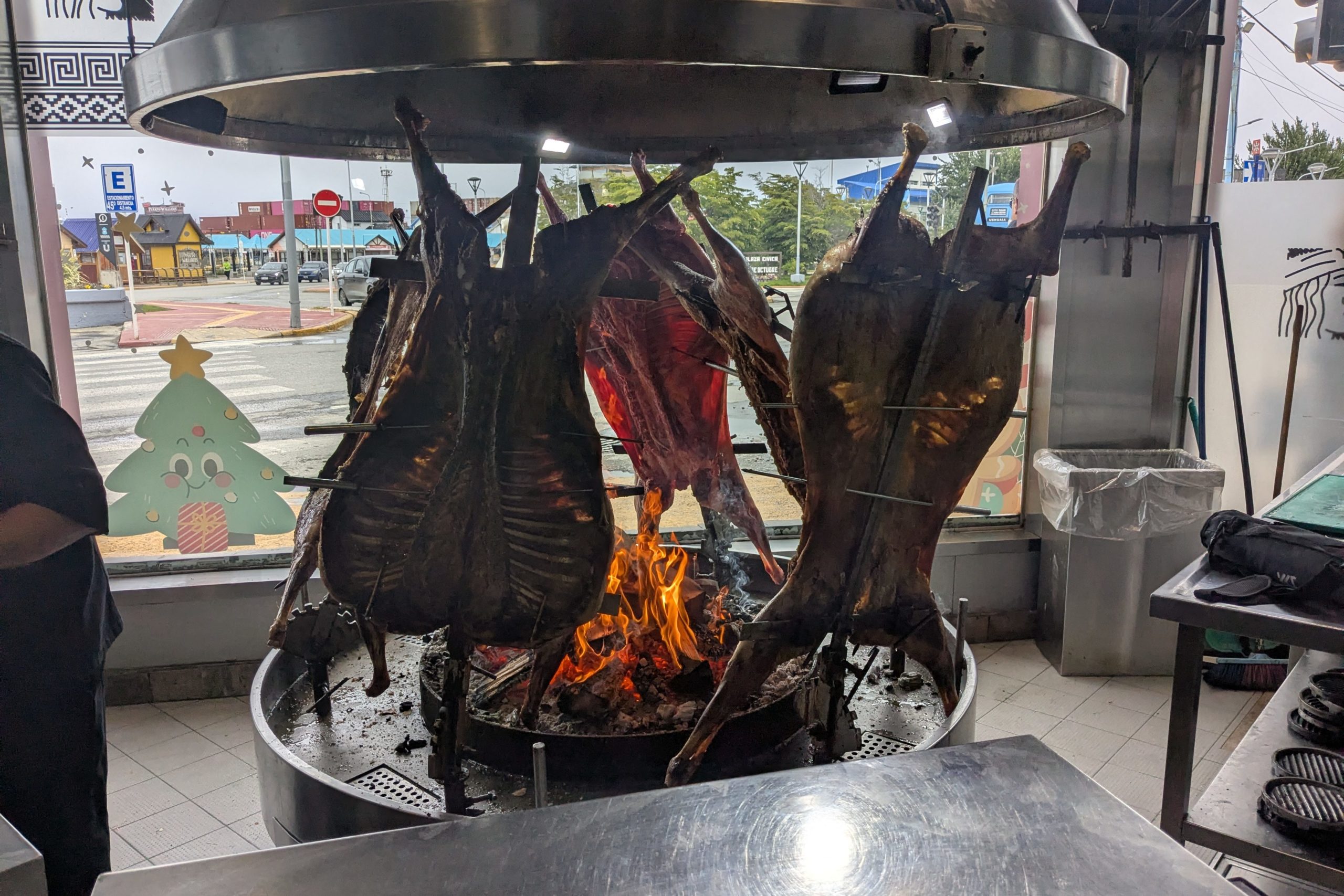 午後、食事がてら散歩に出るが、突然降る冷たい雨であまり遠くまで行きたくない。それと元旦は休日なのでレストランも閉まっている店が多い。てきとうに見つけた所に入る。店先では開いた羊を炙っていた。