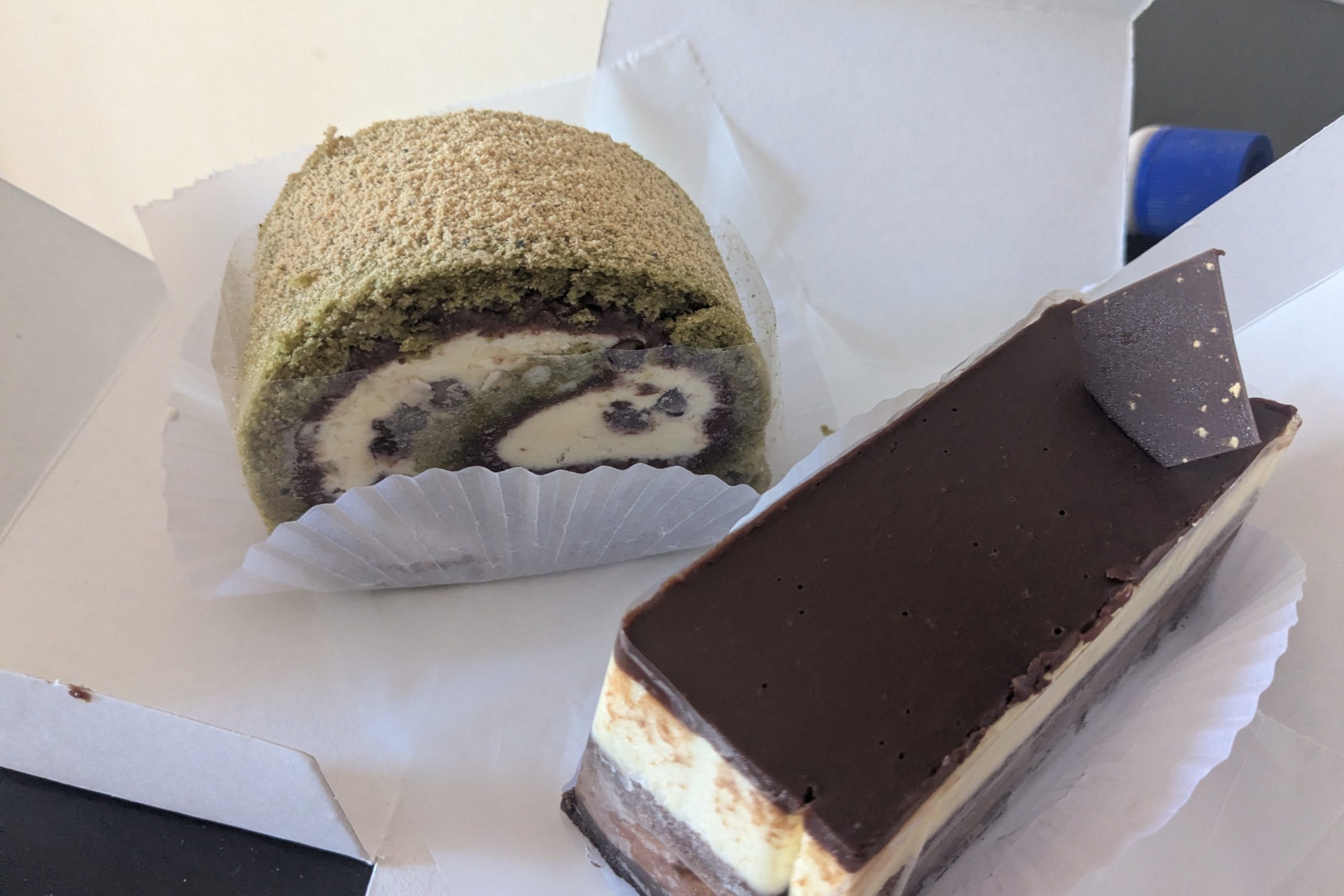 抹茶のロールケーキ。生クリームにあんこ、上にきな粉が散らしてある。日本のセンスだ。右のはチョコの下にマスカルポーネクリーム。