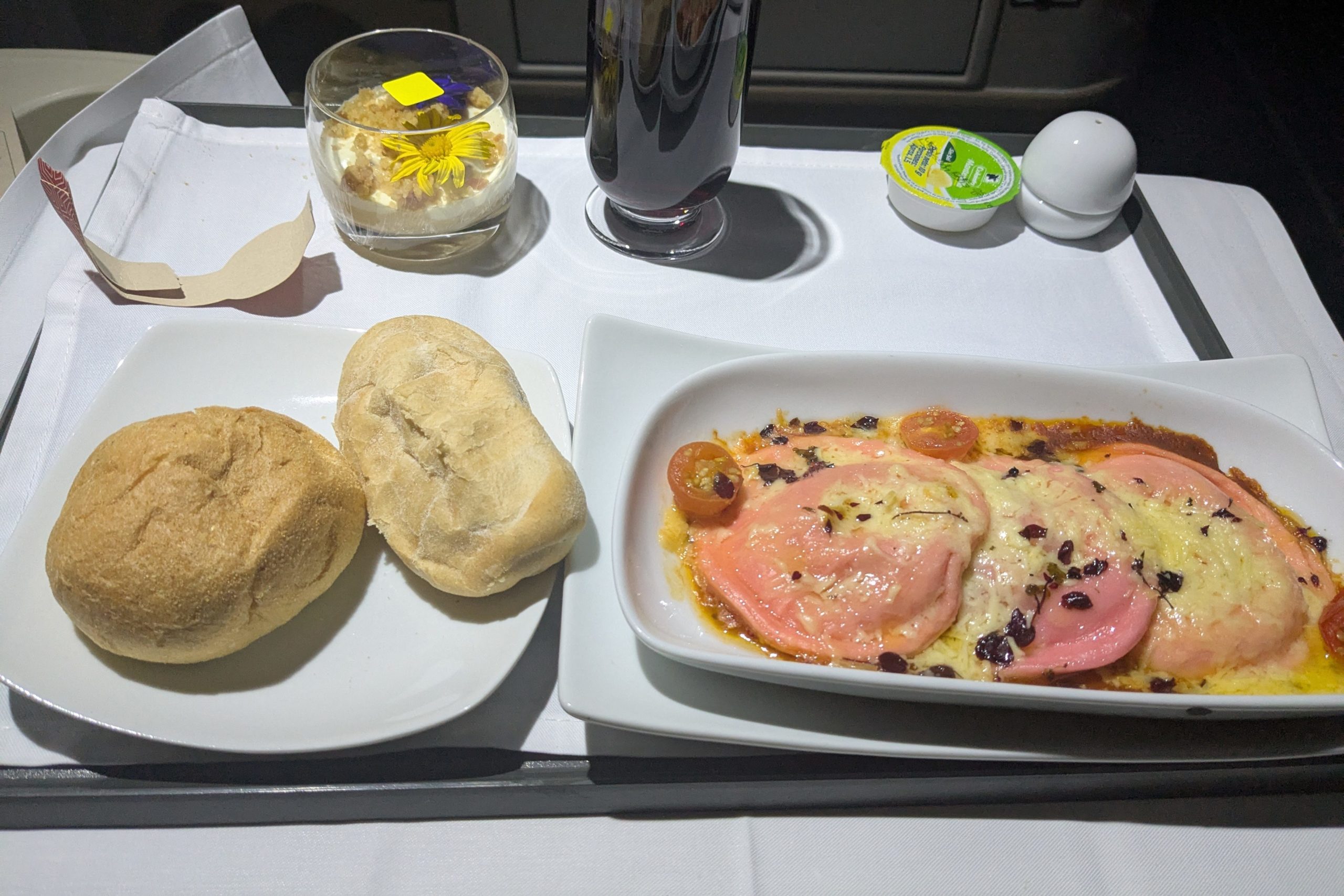 安定飛行になると機内食の時間で、最初に飲み物を聞かれる。筆者はあまりアルコールを飲まないが、ヨーロッパ最終記念にワインにする。ワインリストを見ても解らないので一番上のやつをそれらしく指差す。