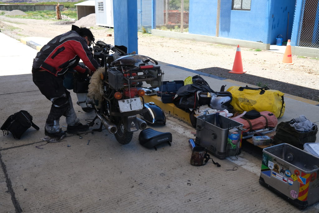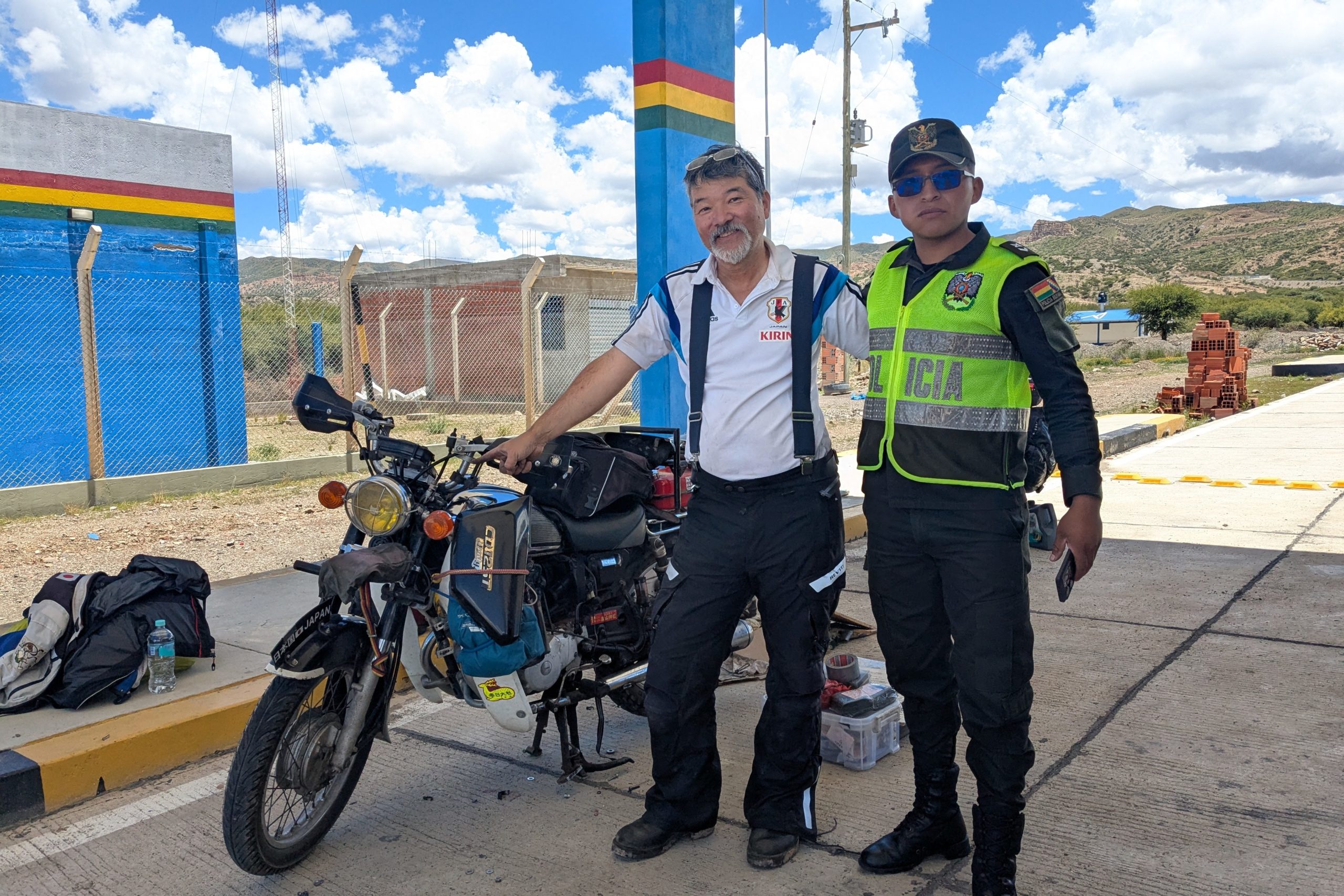 エクアドル君には、ガソリンの他、空気入れ・予備の新品チェーン・フォグランプ・その他小物類をあげた。そしてバイクはというと、若い地元ポリスが引き受けてくれた。スペアパーツもたっぷり残したので、復活させてほしいものだ。ナンバーは当然外したのでボリビアでは無登録車だ。でもなんとかなりそうな国である。