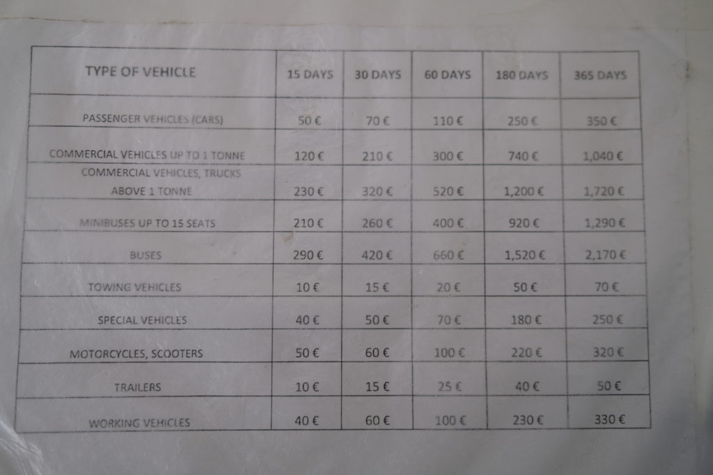 最短の15日間で50ユーロ。バイクも車と同額。しかも筆者の場合、1泊2日ですからね、北マケドニアにいるのは。50ユーロは寄付したと思うことにする。