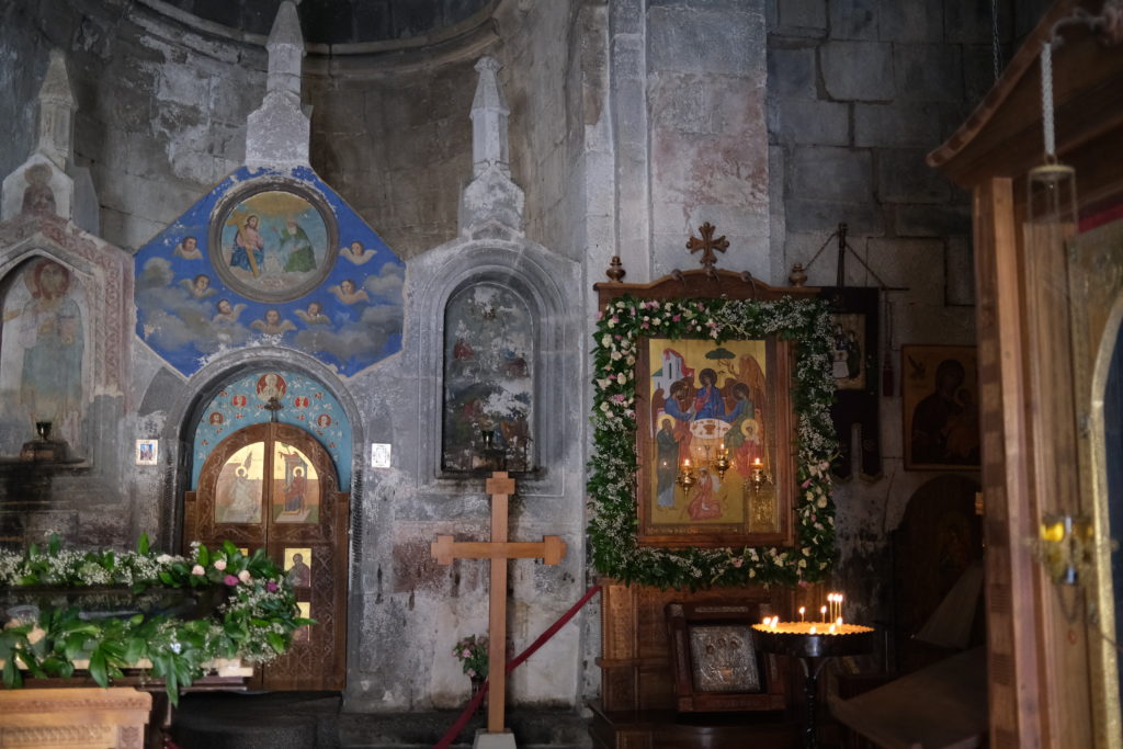 荒れた舗装の道を走る。まもなく谷あいにステパンツミンダ(カズベキ)の街が見えてくる。また右側には14世紀に建てられた三位一体教会も見える。せっかくなので行きましょう。