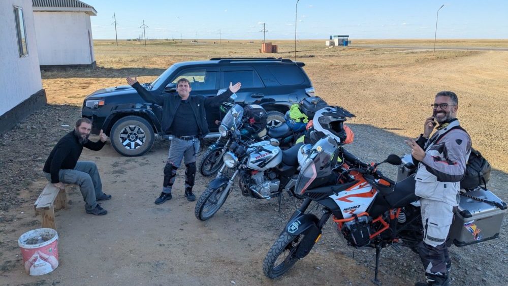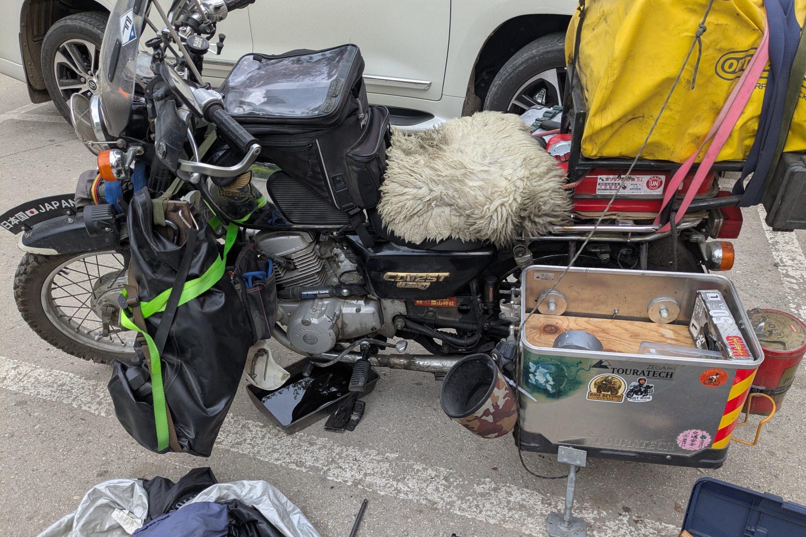 オイルはガソリンスタンドで買ったカザフスタンのやつ。一応API規格はホンダ純正G1と同じSLグレードなので大丈夫でしょう。前回キルギスでの交換から、3,700km。朝ごはんを食べたらすぐに始める。