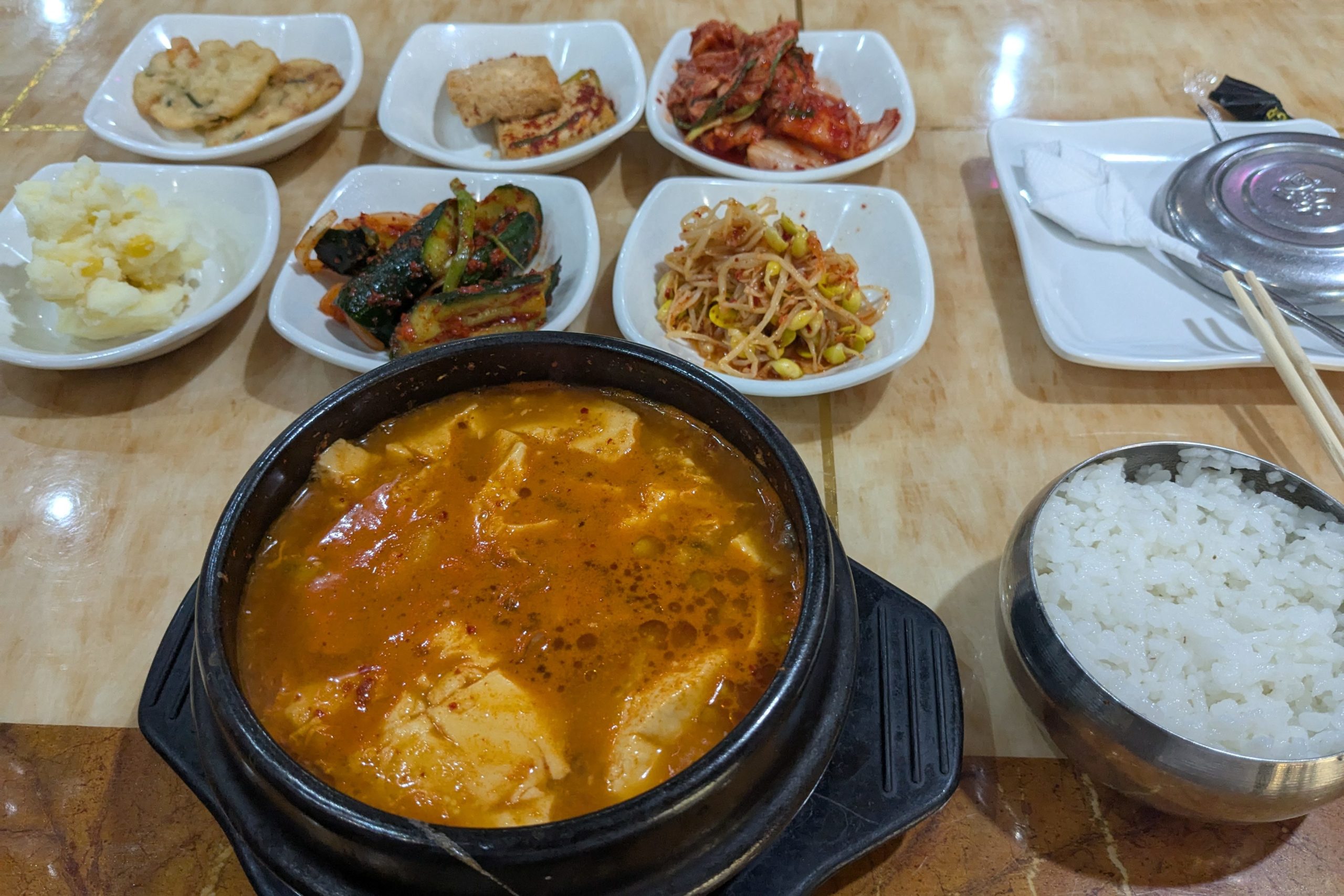 スンドゥブチゲ800ソム。韓国で食べるのと変わらないクオリティ。パンチャン(おかず類)も美味しかった。オススメです。