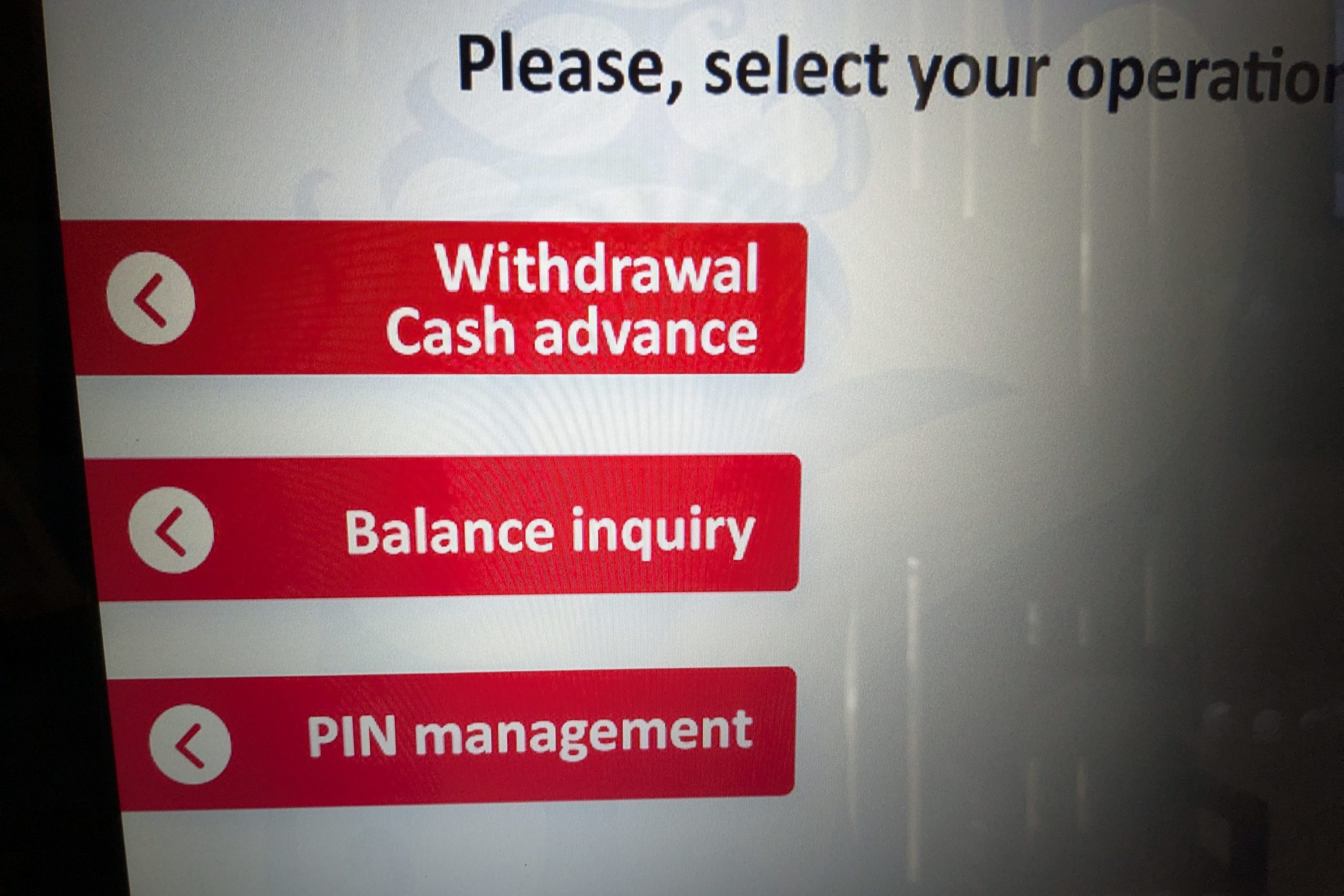 カードを入れる→暗証番号を入力→言語を選ぶ→そしてこの画面。