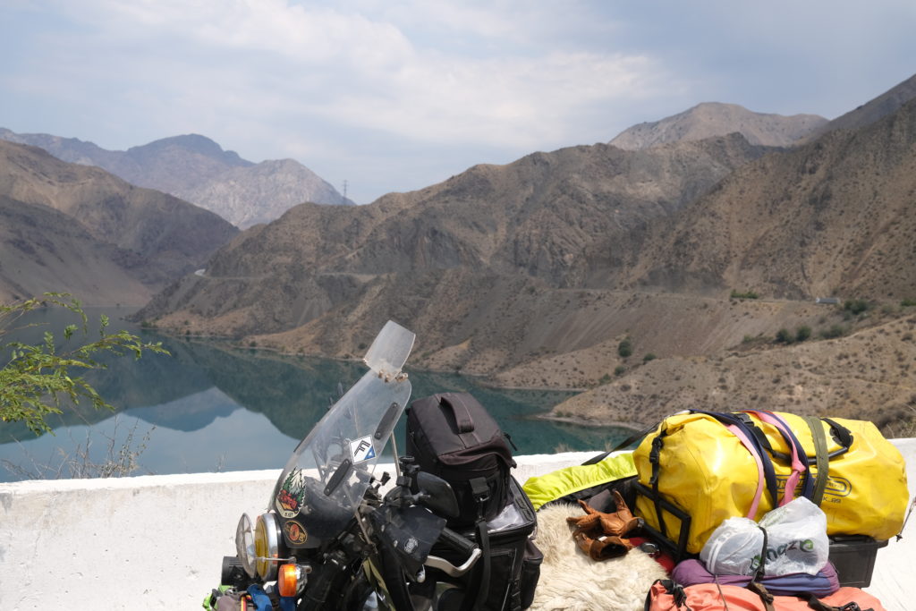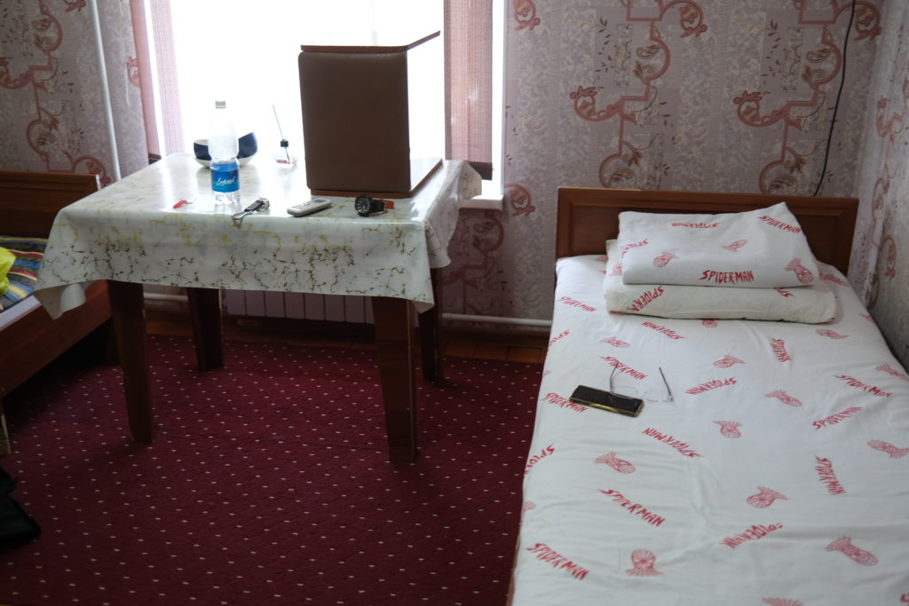オシのホテルに到着後、早速作業開始。場所がホテル敷地内だが、日陰がなくカンカン照りで暑い。フェルガナ盆地一帯の気候をもろに受け、途中何度も水を飲む。熱中症寸前、気力を振り絞りキャブレターをいじる。