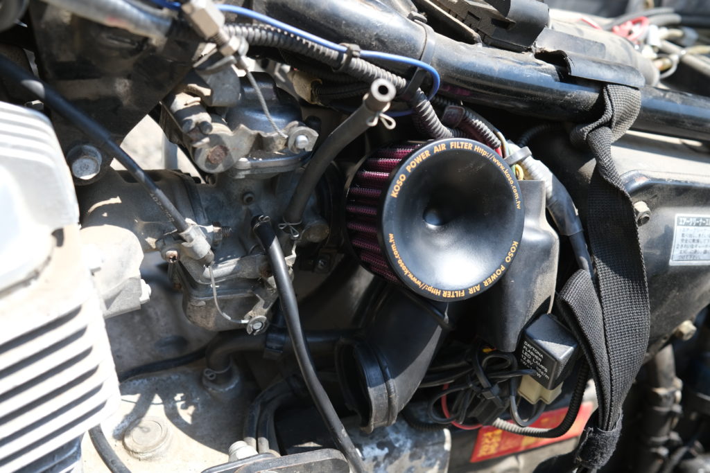 キャブは「スタンダード」の番手にしたメインジェットと同様に、ジェットニードルも番手を下げ、標高が高い=空気が薄いに対応する。オシの標高は約1000mなので、パワーフィルターも装着しておく。次の街サルタシュは3000m、いわば実験的運用だ。パミールに入れば4000m越えの峠があるため、空気も薄い。最悪さらに燃調を「薄め」にする選択肢は残されている。