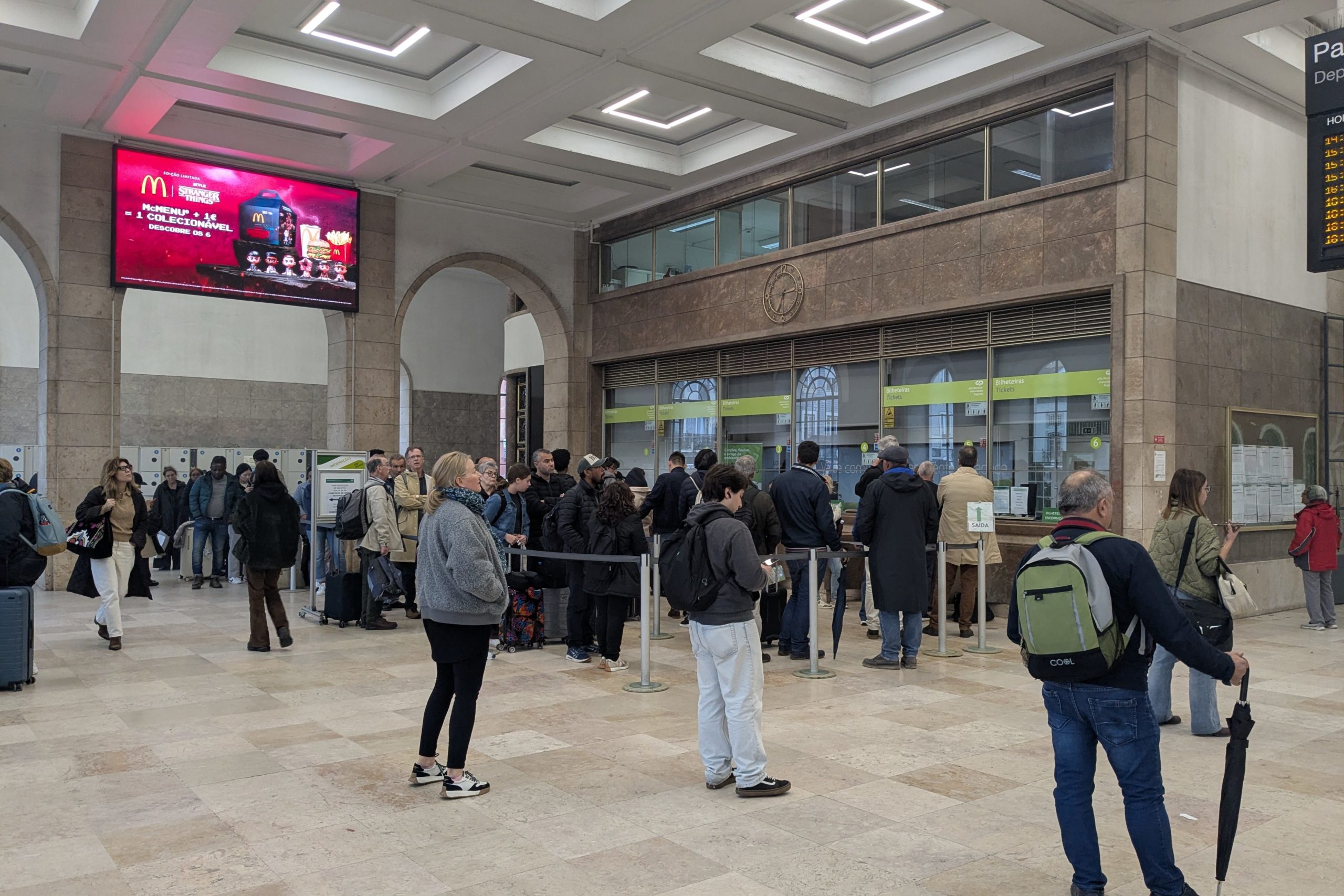 さて、ストライキをしているというポルトガル国鉄、ここまでその影響は全く無かった。ところが始発駅に着き、ポルト行きの特急列車の出発時間を待っているときに、この特急列車のキャンセルに見舞われた。しかしポルトガル国鉄の案内はひどい。電光掲示板にはキャンセルの文字は無く、はっきりした英語の放送も無かった。出発時間の14時になる頃になってもそれらしい列車の入線は無く、特急列車を待っている様子の人々が駅の窓口に集まり始めた。運休の気配がした。