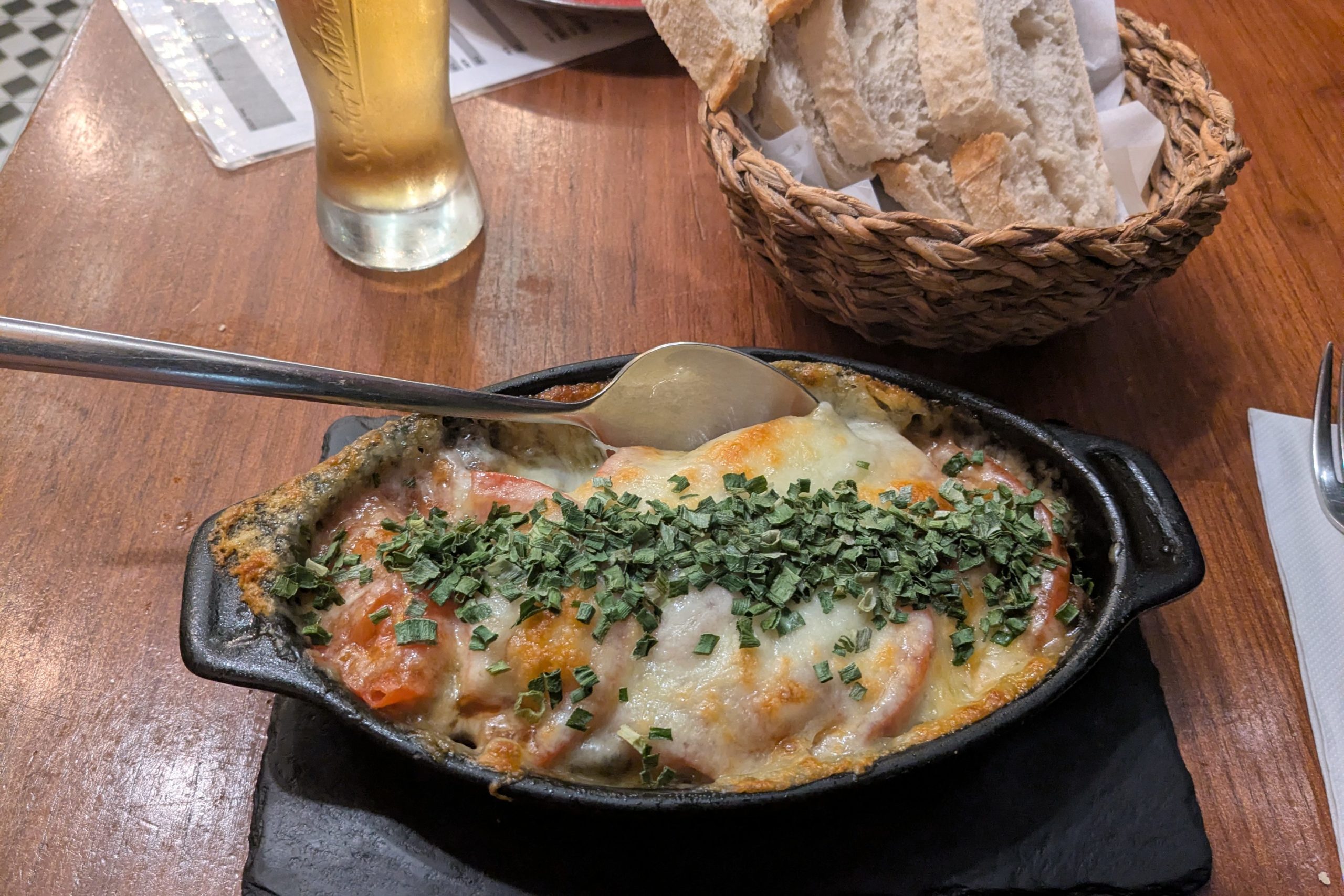 きのこ・トマト・モッツァレラチーズのグリル。パンとビールとで18.2ユーロ。