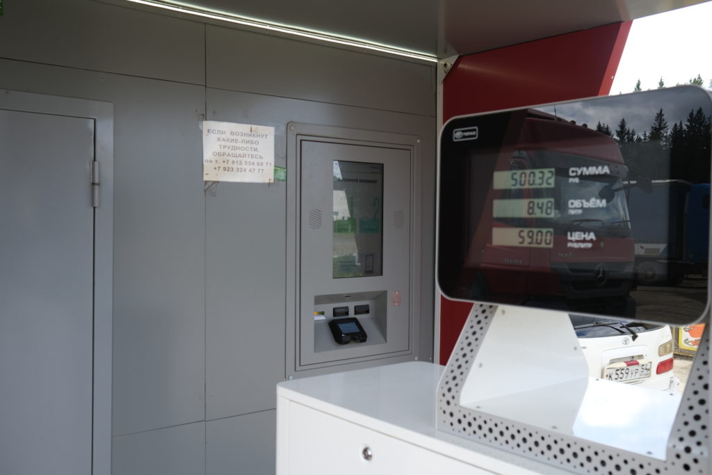 途中給油のタイミングにミスり、ようやく入ったガソリンスタンドは無人の自動販売機方式だった。先に給油をしていたおじさんに助けてもらった。