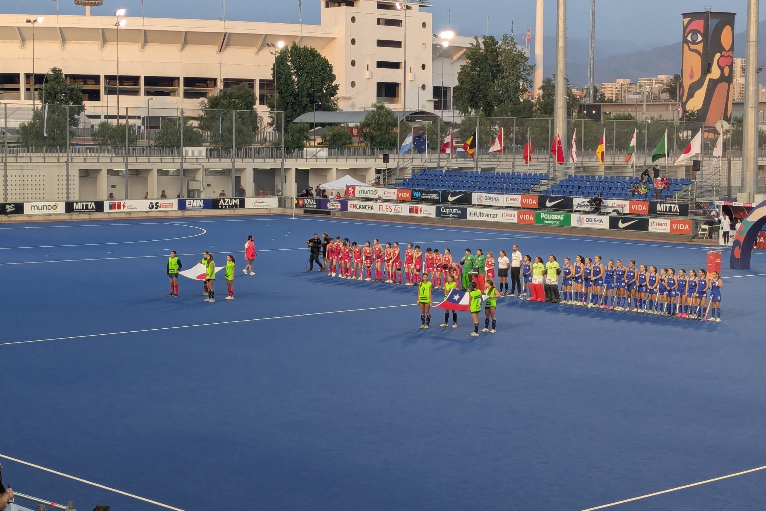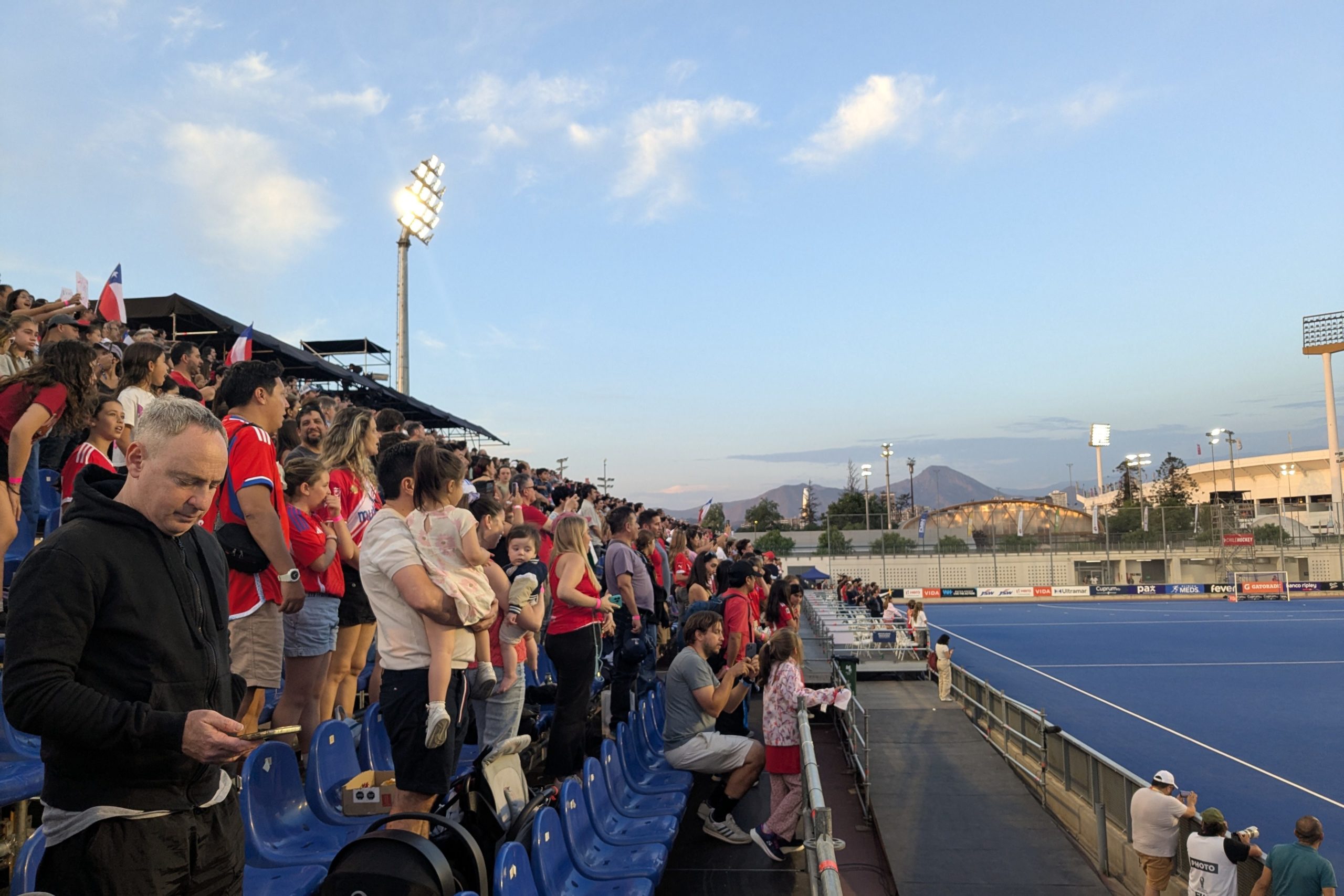 大使館の方に少しルールを教えてもらいながら応援した。15分×4で、少しサッカーにも似ている。でもよく分からなかった。予選は3試合で、中1日後に最強のオランダ戦、その中1日後に開催国のチリ戦となり2位以上で上位戦に行ける仕組みとなっている。